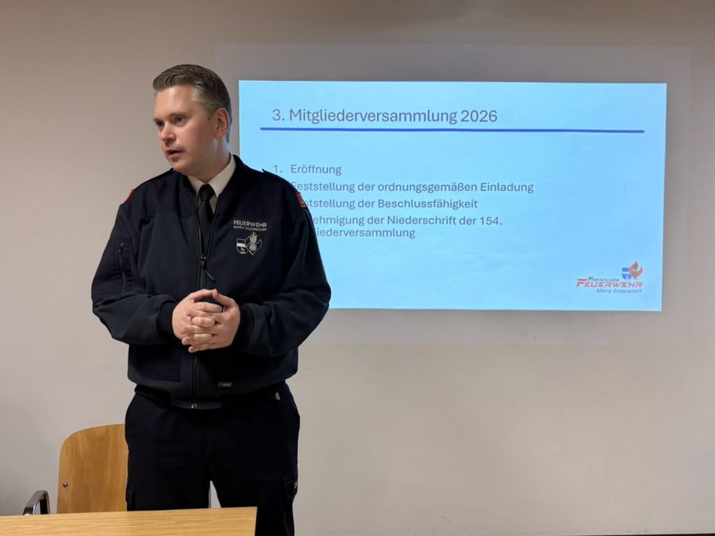 Kommandant OBI Josef Osterkorn eröffnete am 19. März 2026 um 19:00 Uhr die Mitgliederversammlung der Freiwilligen Feuerwehr Maria Enzersdorf im Feuerwehrhaus. Zu Beginn der Versammlung