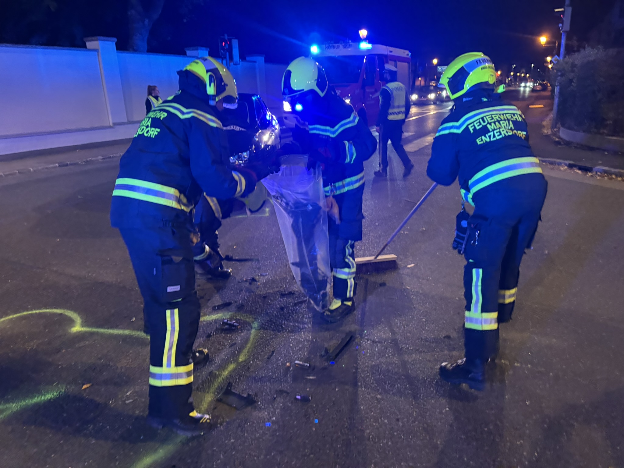 Aus bislang unbekannten Ursachen kam es im Kreuzungsbereich zu einem Zusammenstoß zwischen einem PKW und einem Moped. Deshalb wurde, am 26. Oktober 2025, die Freiwillige Feuerwehr Maria Enzersdorf, um 19:45 Uhr, zu einem Verkehrsunfall alarmiert. Beim Eintreffen der Feuerwehr Maria Enzersdorf, war die Polizei bereits vor Ort und die beiden verunfallten Mopedinsassen wurden mit einem Rettungswagen abtransportiert. Nachdem die umherliegenden Teile der beiden Fahrzeuge von der Straße entfernt worden waren, wurden der PKW und das Moped sicher in einem Parkstreifen abgestellt.