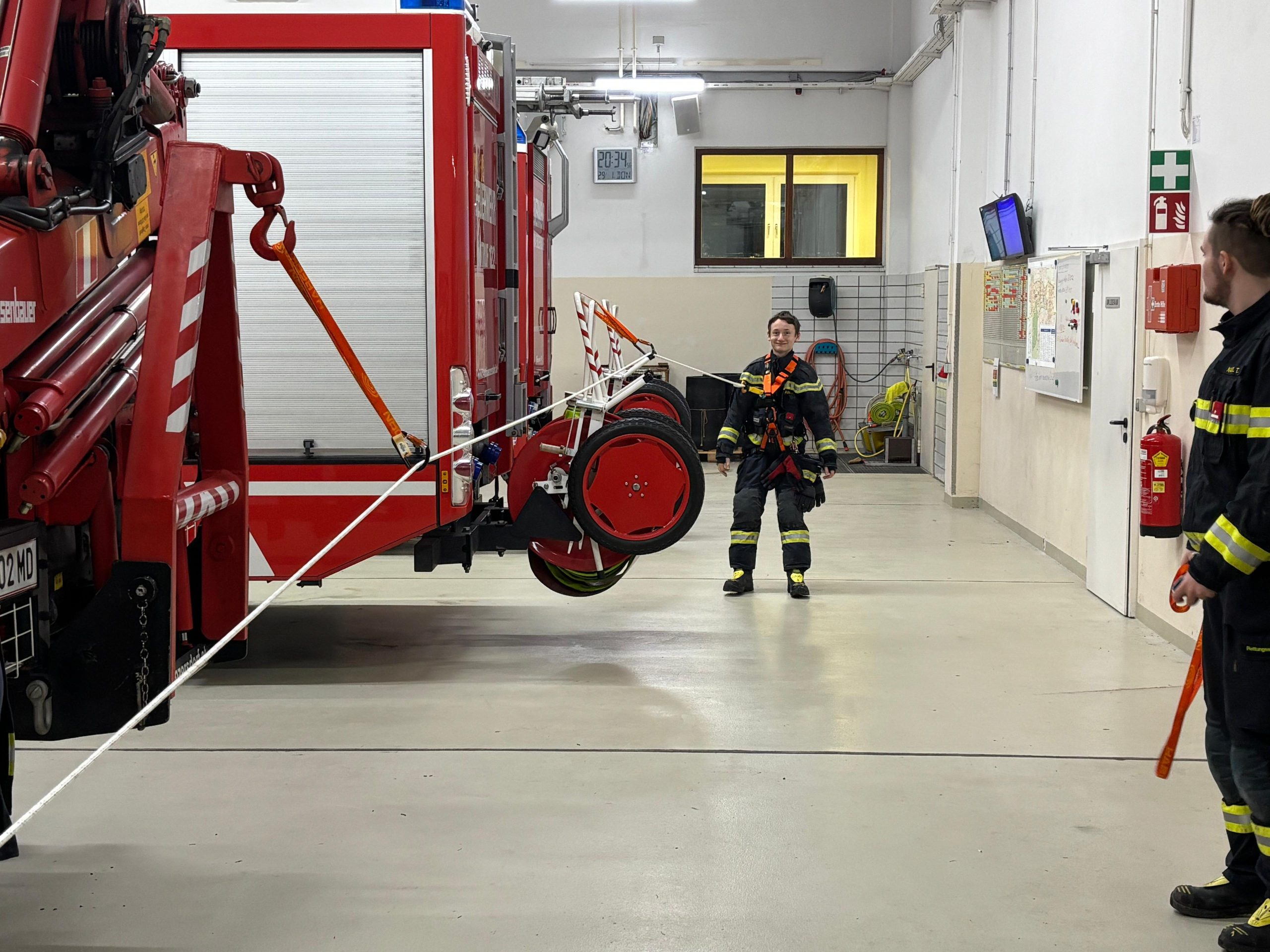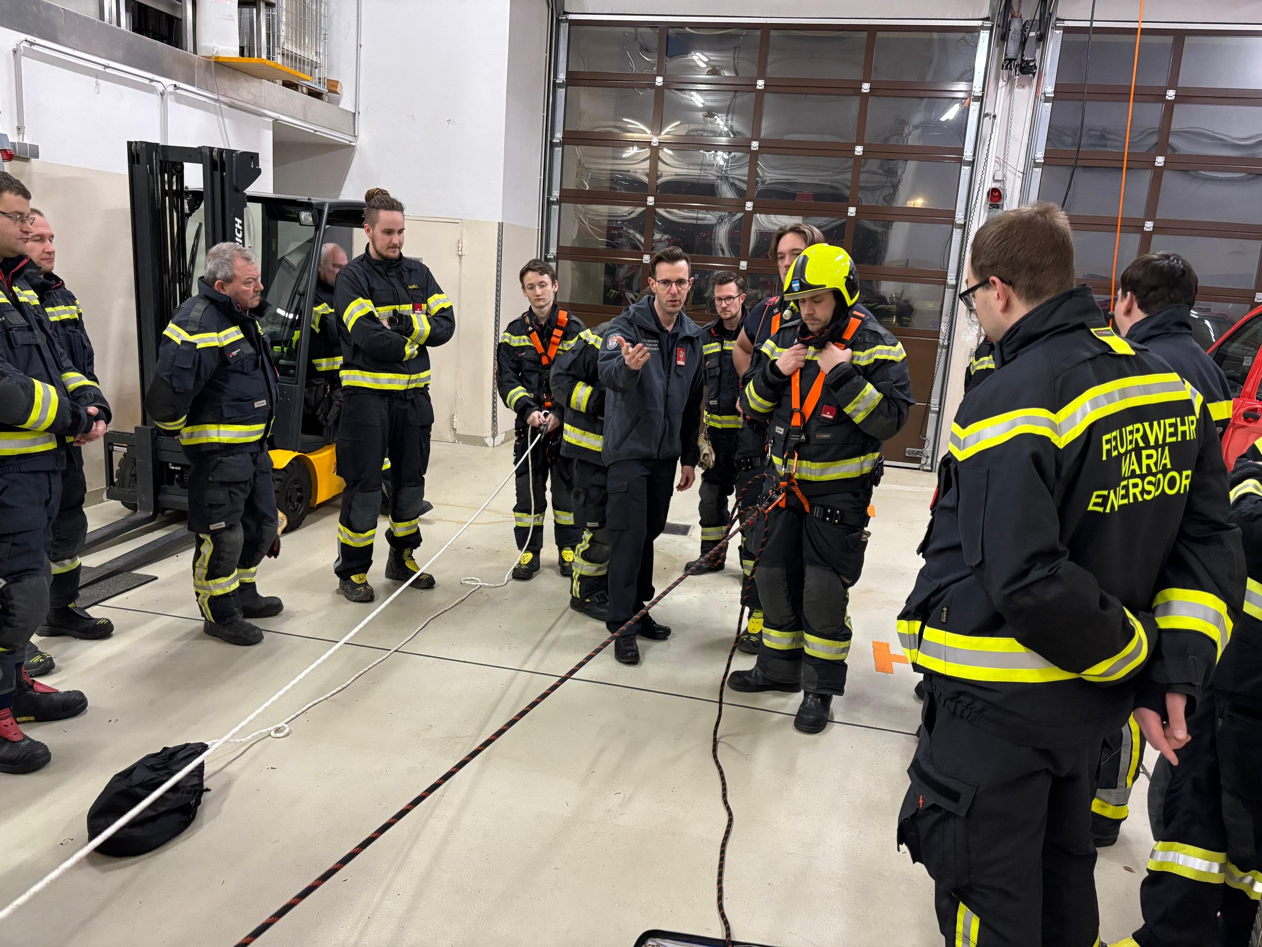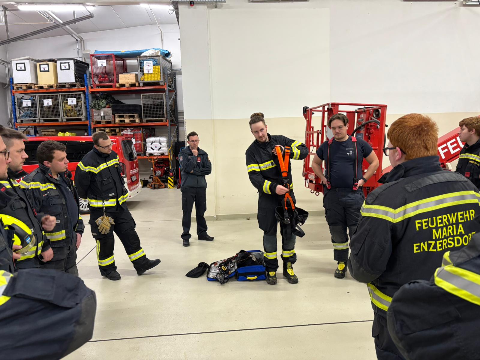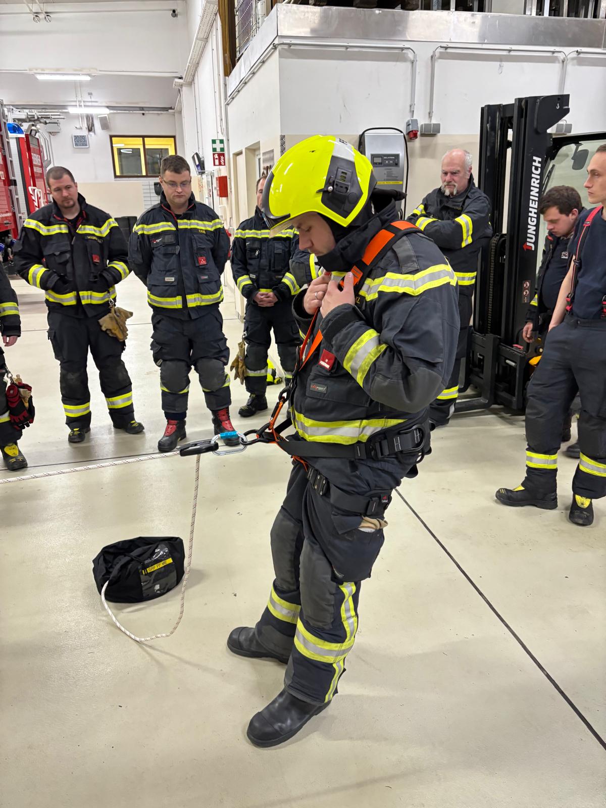 Bei Einsätzen, bei denen Feuerwehrmitglieder der Gefahr eines Absturzes ausgesetzt sind, kommen zwei verschiedene Arten der Absturzsicherung zum Einsatz. Damit diese Geräte stets gewissenhaft bedient werden können, ist eine regelmäßige Auffrischung der Kenntnisse erforderlich. Dabei wurden wichtige Handgriffe, sicheres Arbeiten sowie der richtige Umgang mit den Geräten wiederholt. Ein großer Dank ergeht dabei an BM Lukas Derkits von Höhengruppe der Freiwilligen Feuerwehr Wiener Neudorf, der den theoretischen Teil der Schulung übernahm.