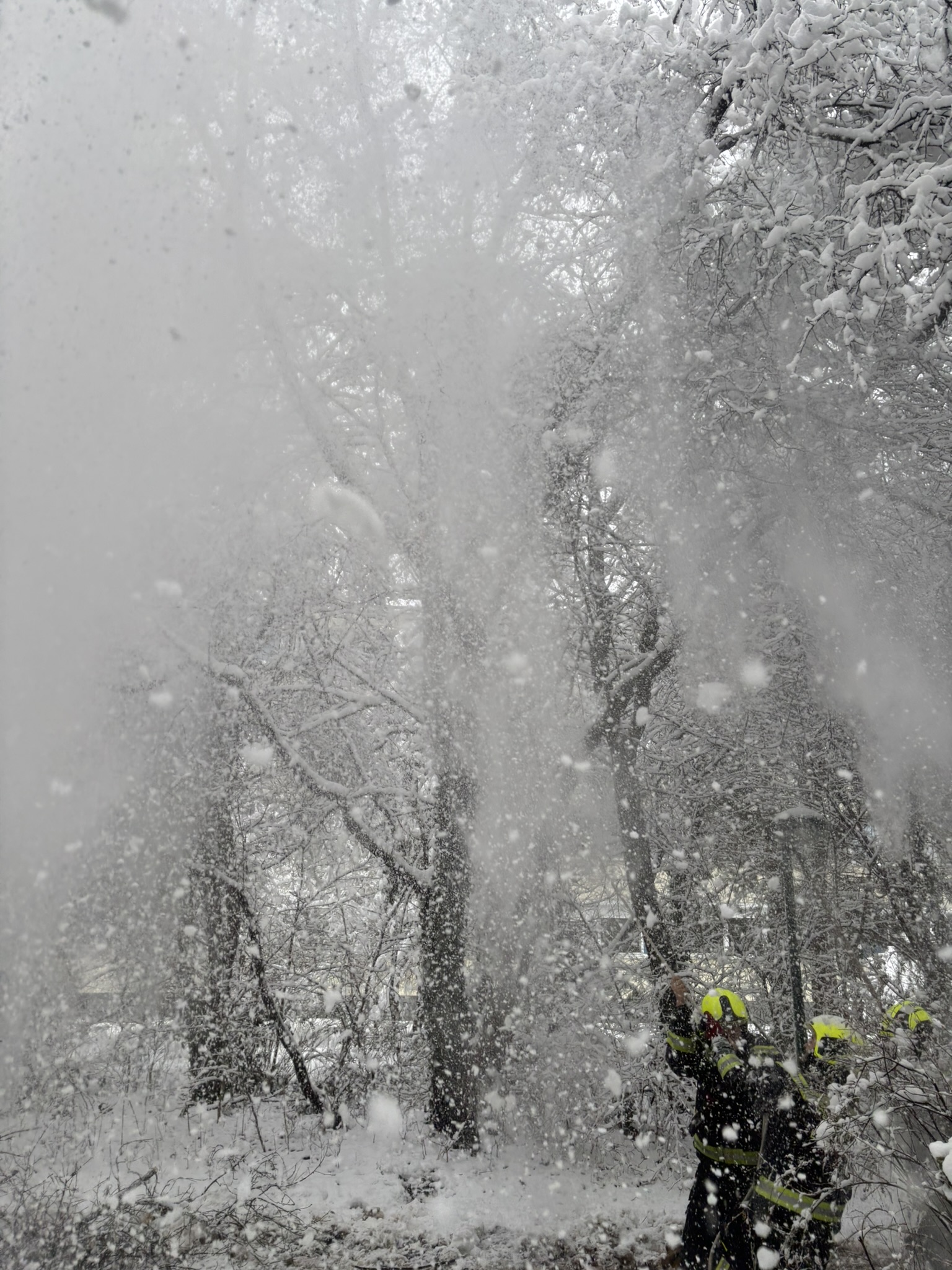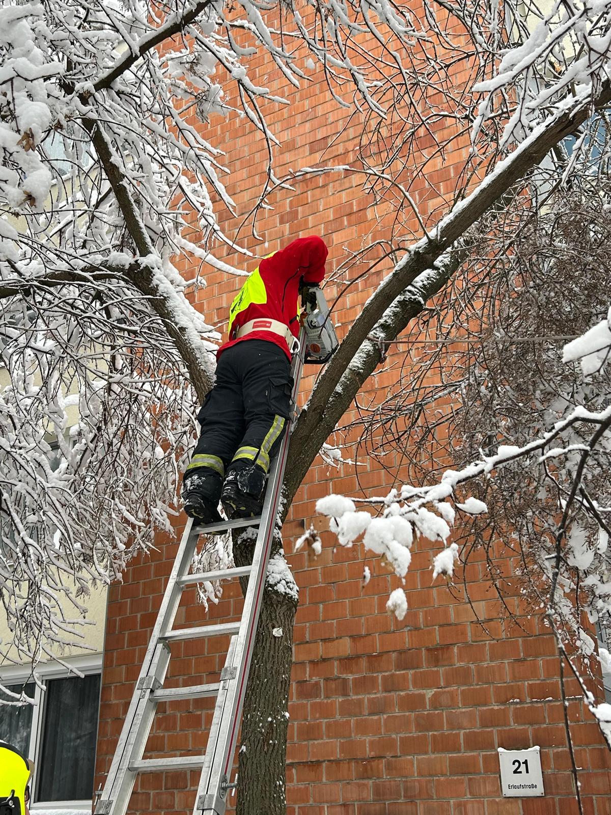 Im weiteren Verlauf wurden die Einsatzkräfte zu weiteren Folgeeinsätzen alarmiert. Dabei mussten zwei weitere abgebrochene Äste über einem Gehweg entfernt werden. Zusätzlich wurden durch die Schneelast stark gebogene Äste mittels Arbeitsleine und Einreißhaken kontrolliert abgeschüttelt, um diese vom Schnee zu befreien und ein präventives Abbrechen zu verhindern.