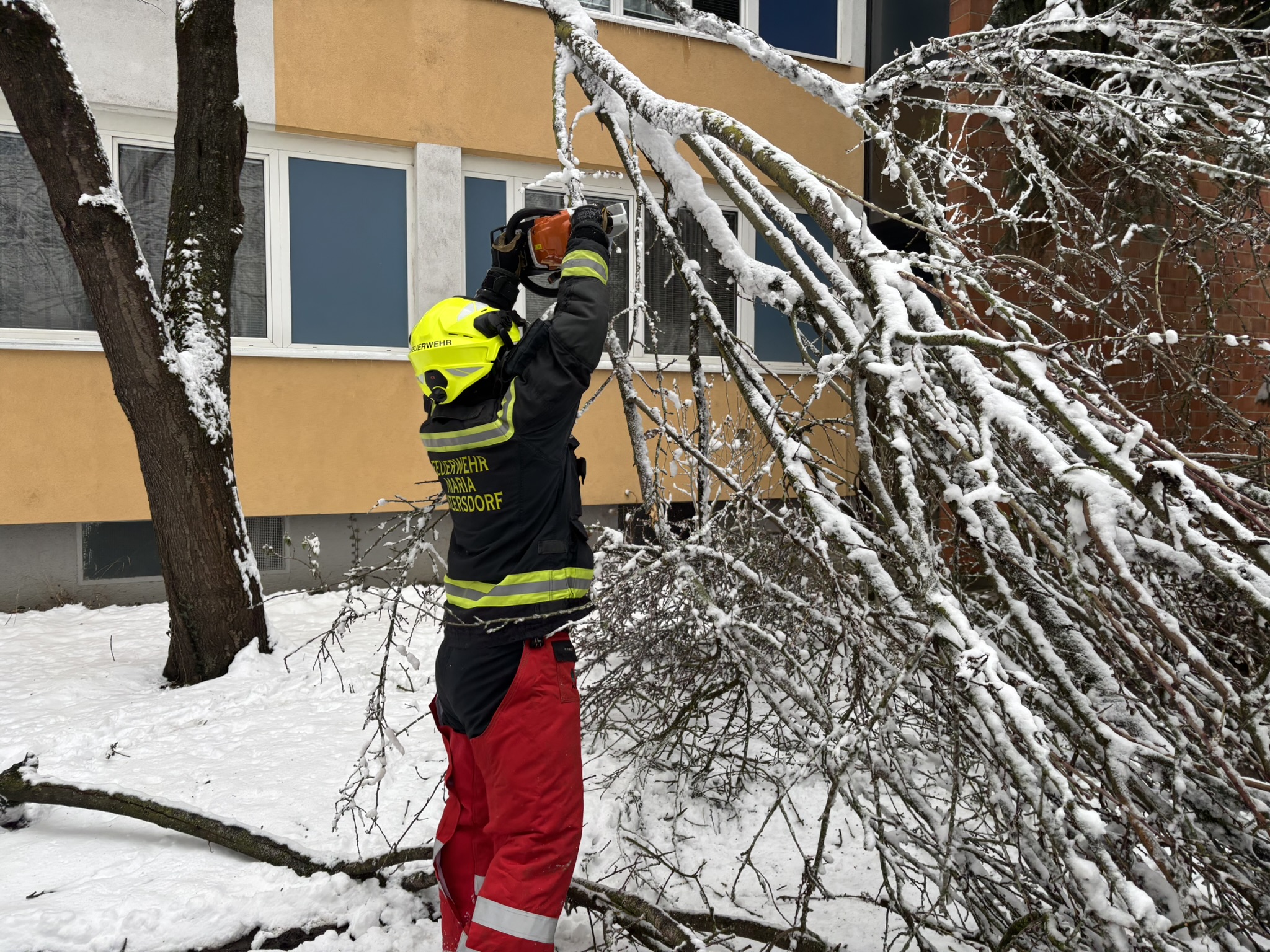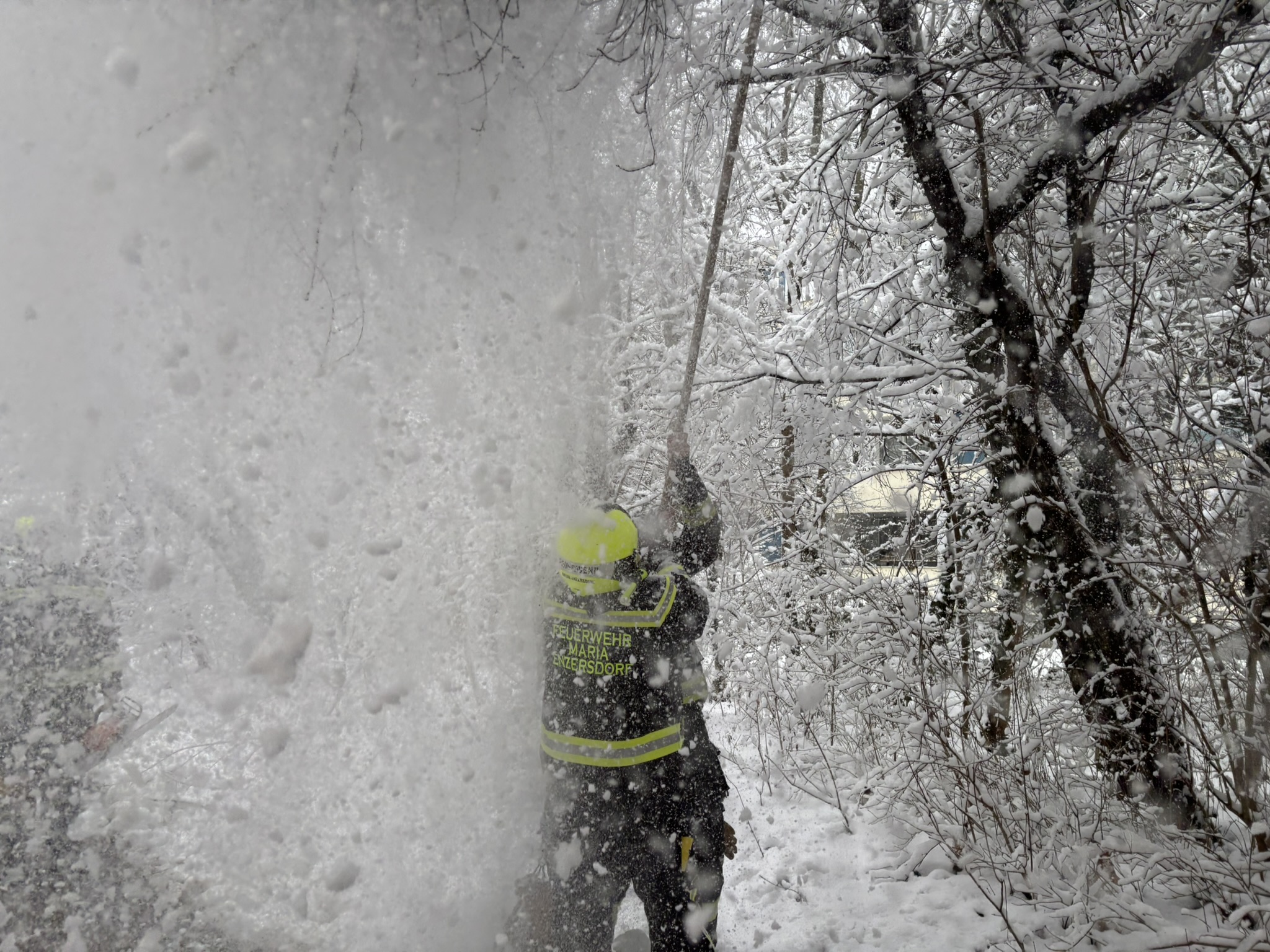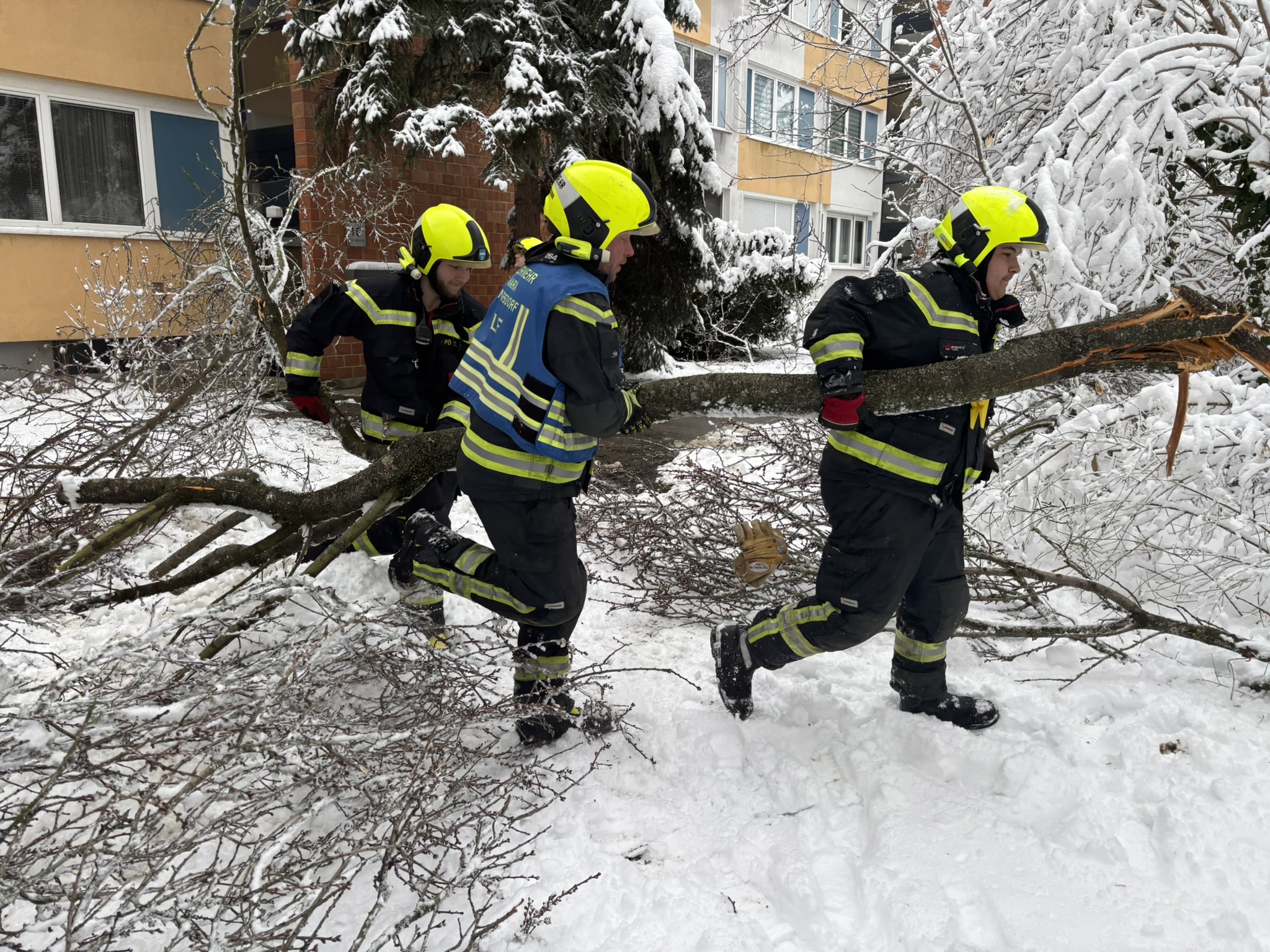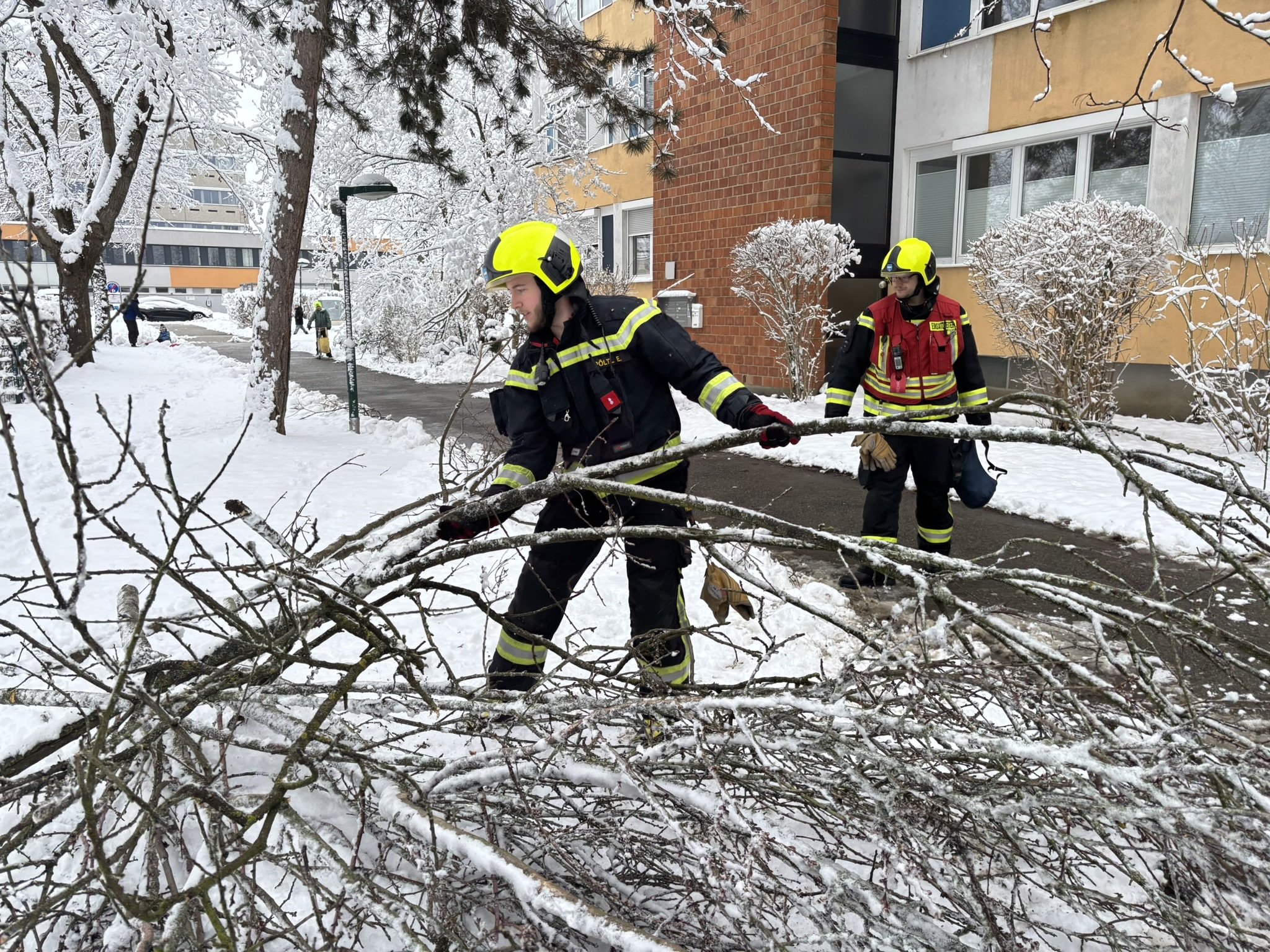 Anschließend wurde die Feuerwehr zu einer abgebrochenen Baumkrone alarmiert, welche auf den Gehweg zu stürzen drohte. Diese konnte mittels Motorkettensäge rasch entfernt werden. Um 13:59 Uhr erfolgte die nächste Alarmierung. Aufgrund der hohen Schneelast war ein Ast abgeknickt und versperrte den Gehweg. Mittels Hubsteiger und Motorkettensäge wurde auch diese Gefahrenstelle rasch beseitigt.