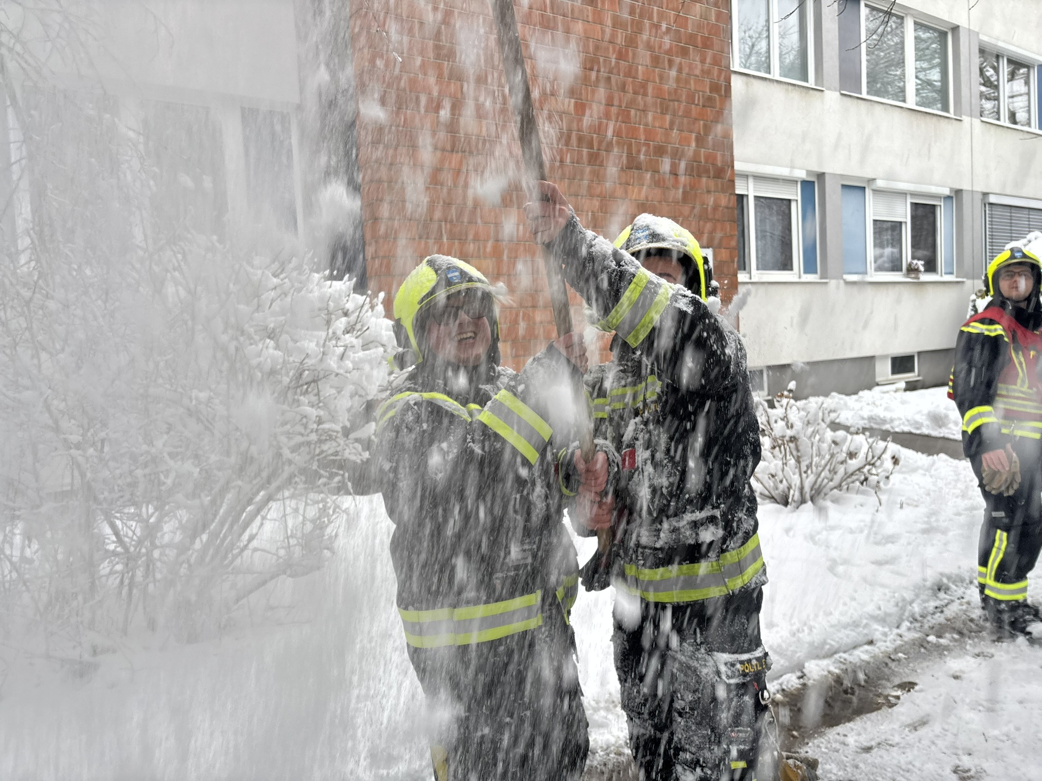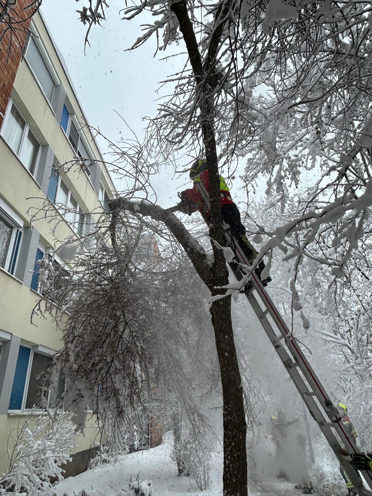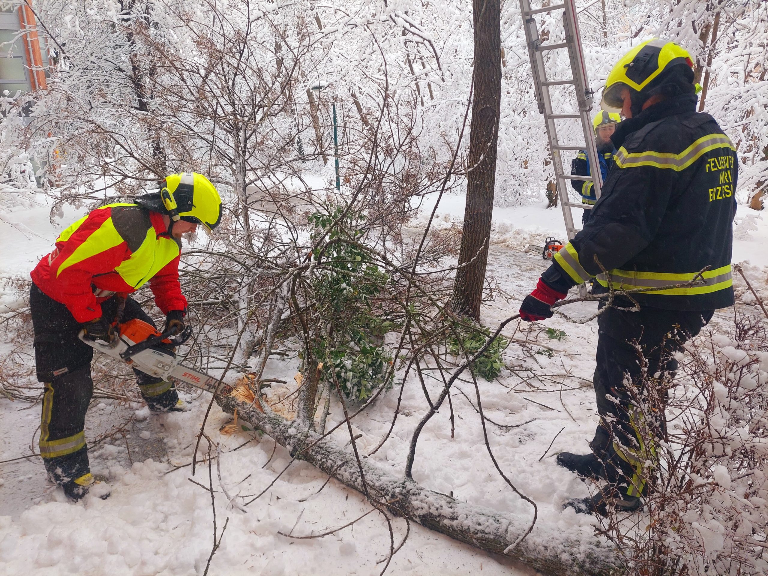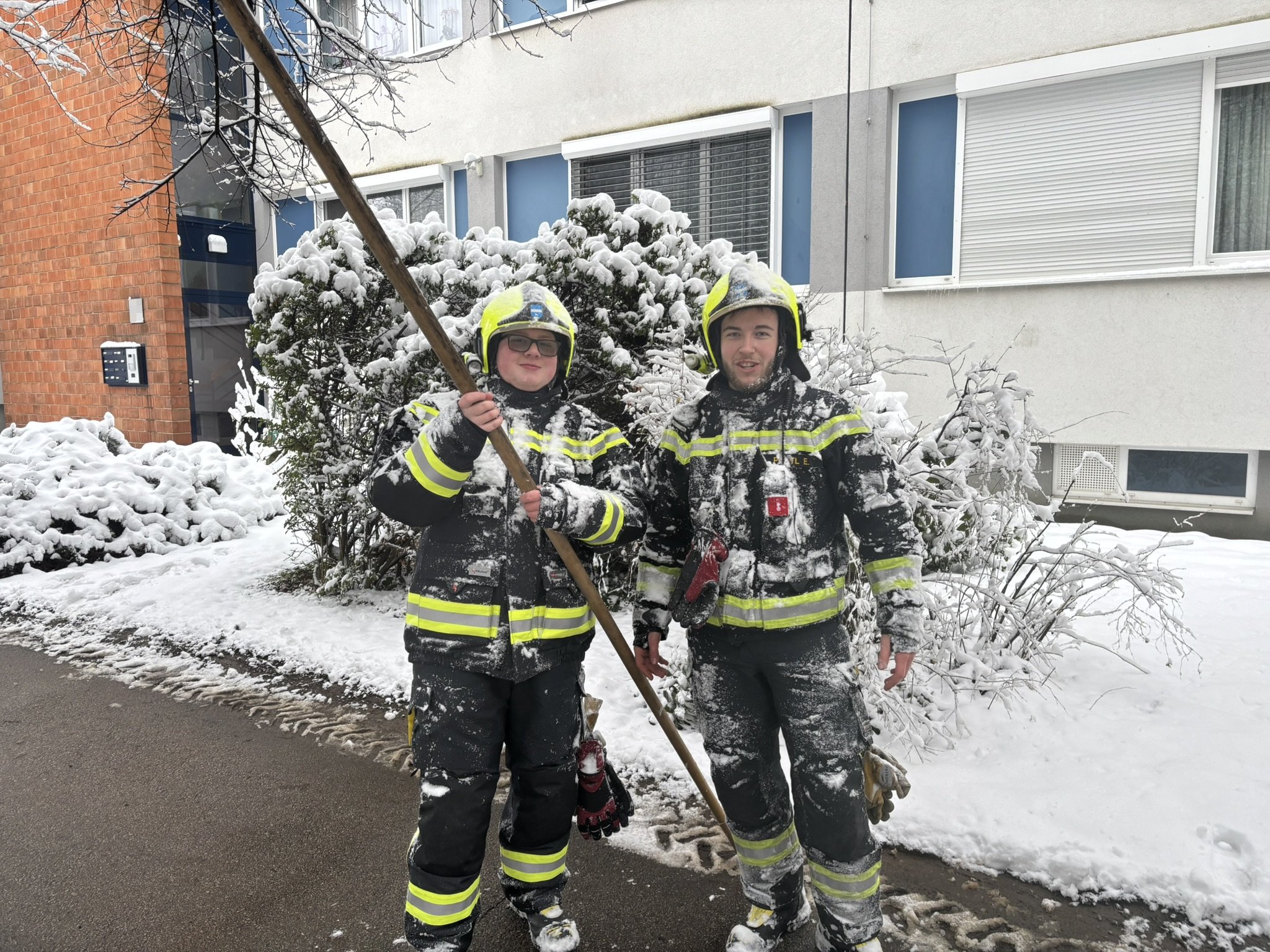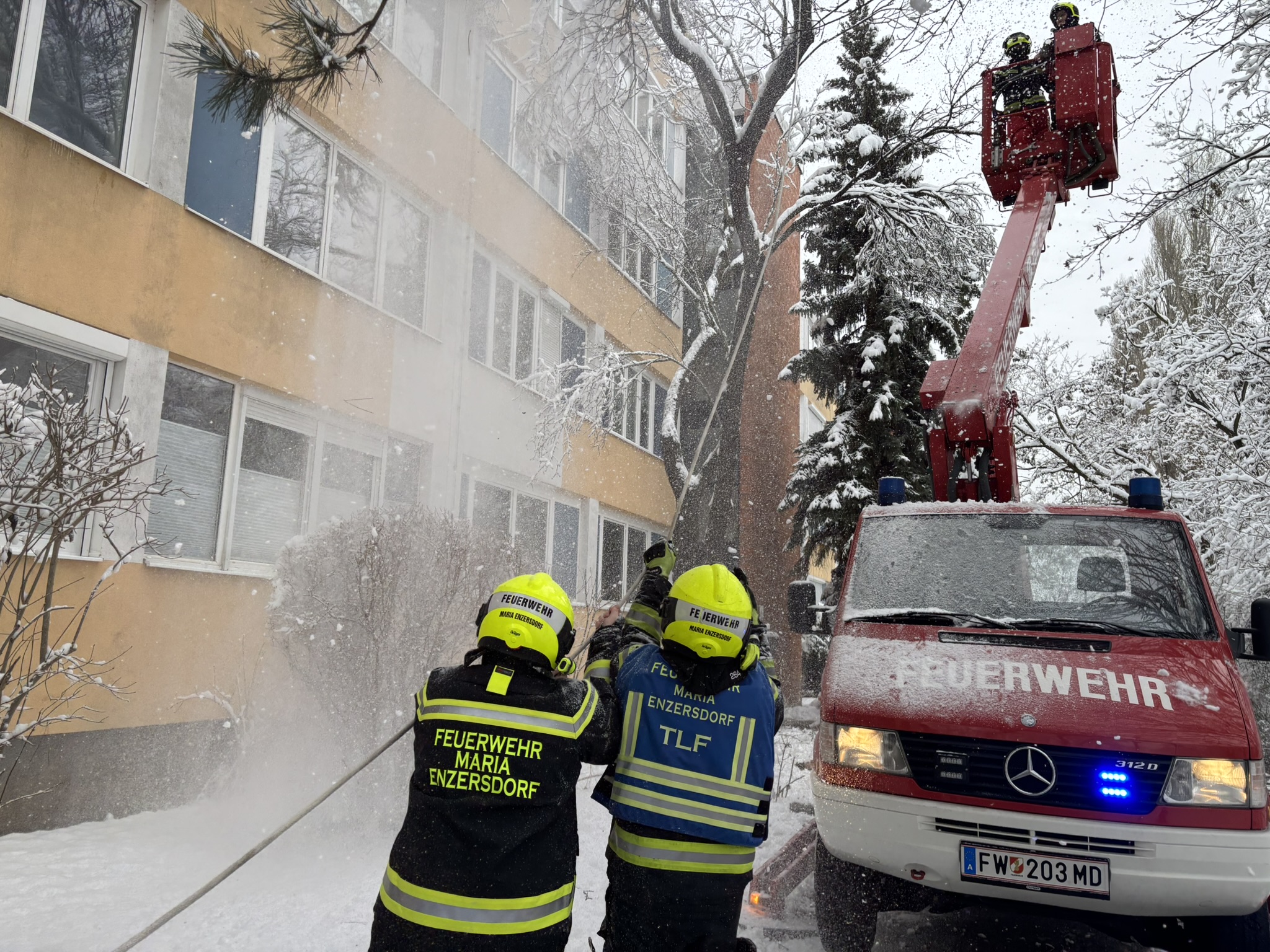 Anschließend wurde die Feuerwehr zu einer abgebrochenen Baumkrone alarmiert, welche auf den Gehweg zu stürzen drohte. Diese konnte mittels Motorkettensäge rasch entfernt werden. Um 13:59 Uhr erfolgte die nächste Alarmierung. Aufgrund der hohen Schneelast war ein Ast abgeknickt und versperrte den Gehweg. Mittels Hubsteiger und Motorkettensäge wurde auch diese Gefahrenstelle rasch beseitigt.