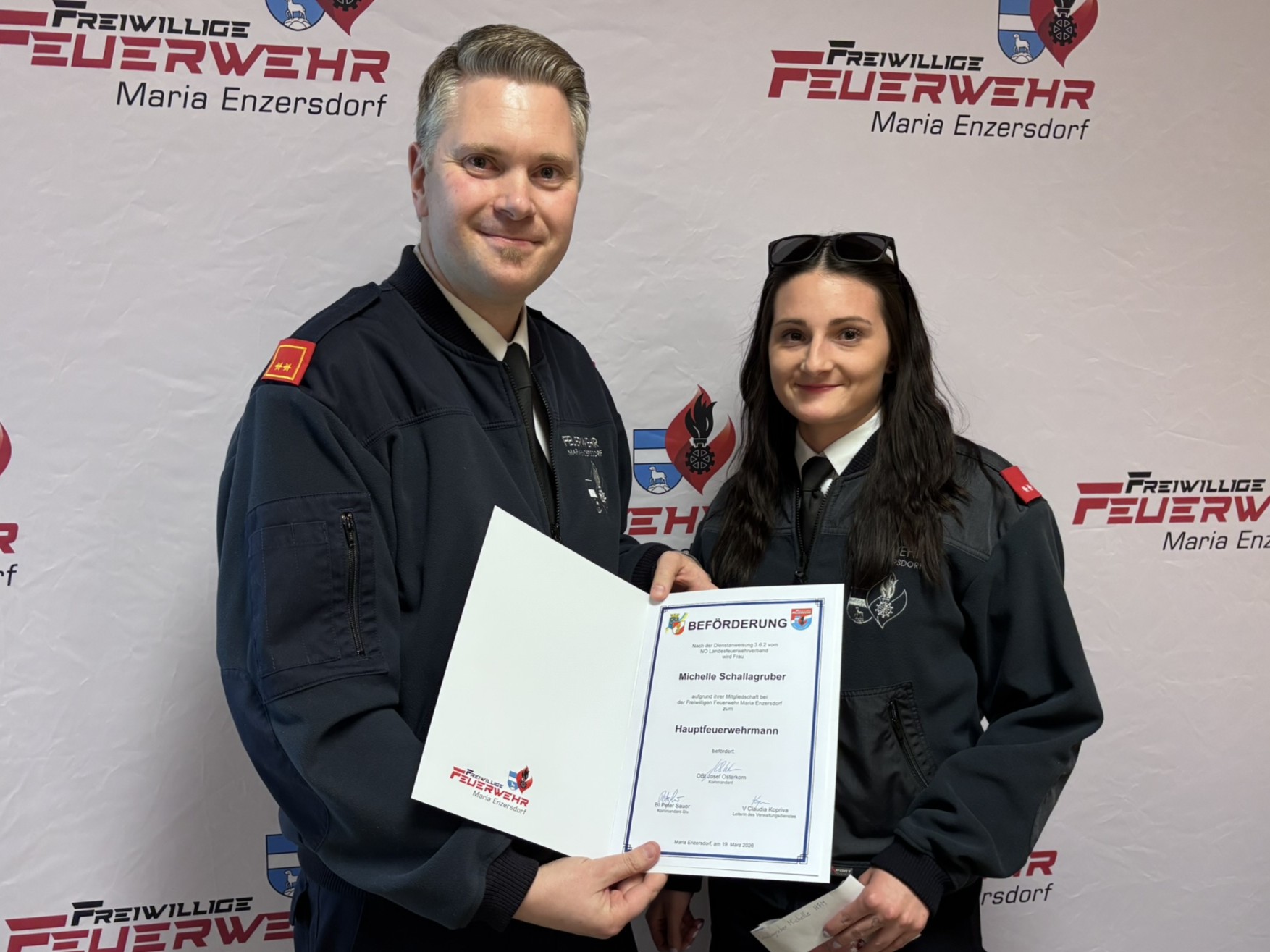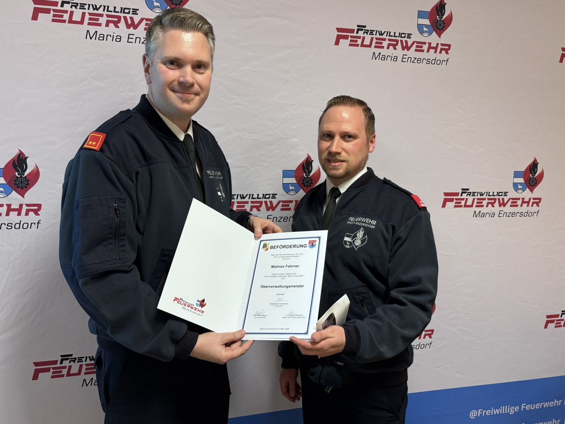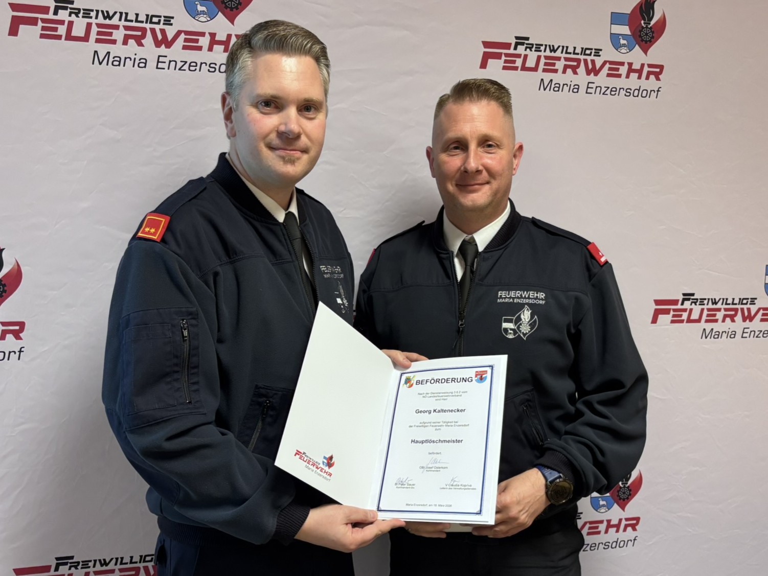 Kommandant OBI Josef Osterkorn eröffnete am 19. März 2026 um 19:00 Uhr die Mitgliederversammlung der Freiwilligen Feuerwehr Maria Enzersdorf im Feuerwehrhaus.