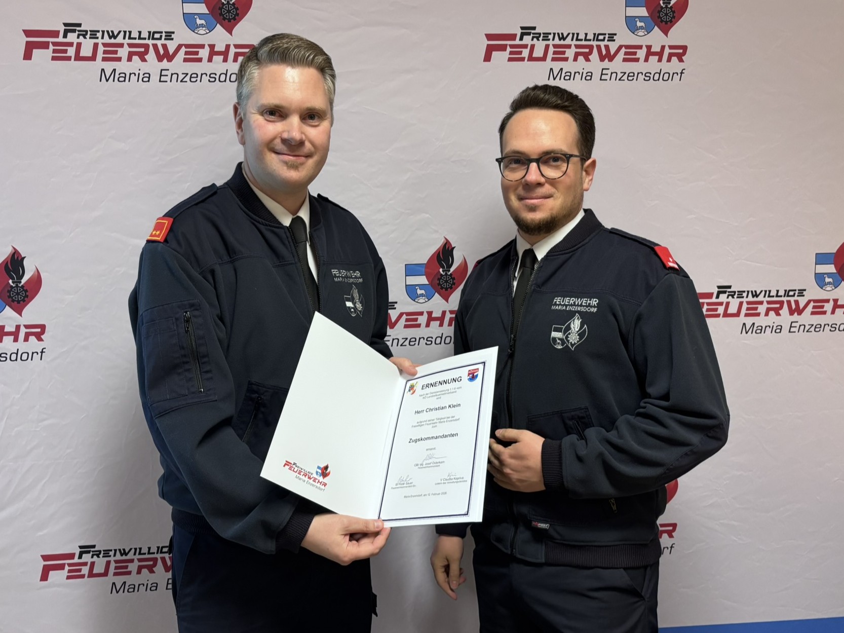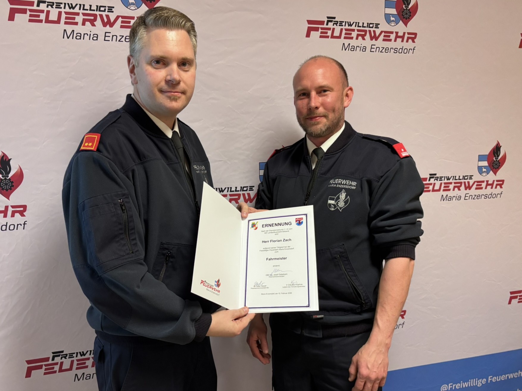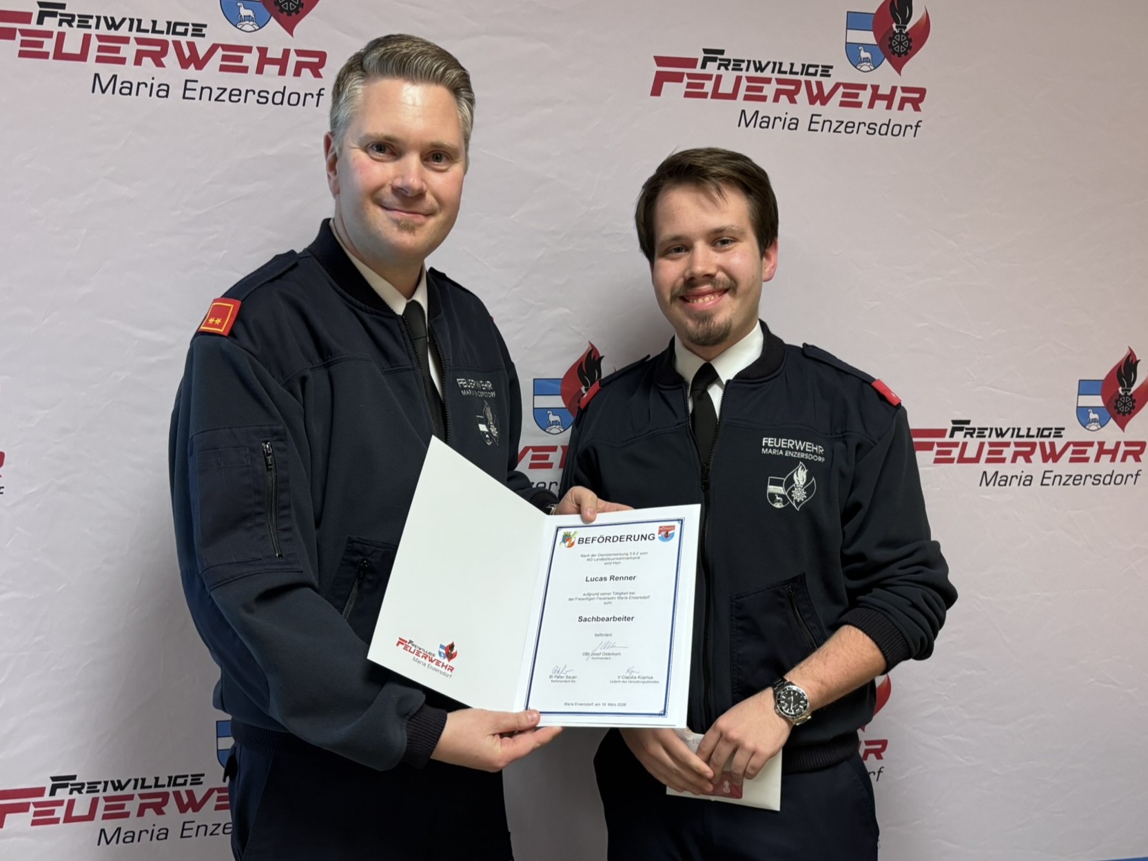 Kommandant OBI Josef Osterkorn eröffnete am 19. März 2026 um 19:00 Uhr die Mitgliederversammlung der Freiwilligen Feuerwehr Maria Enzersdorf im Feuerwehrhaus.