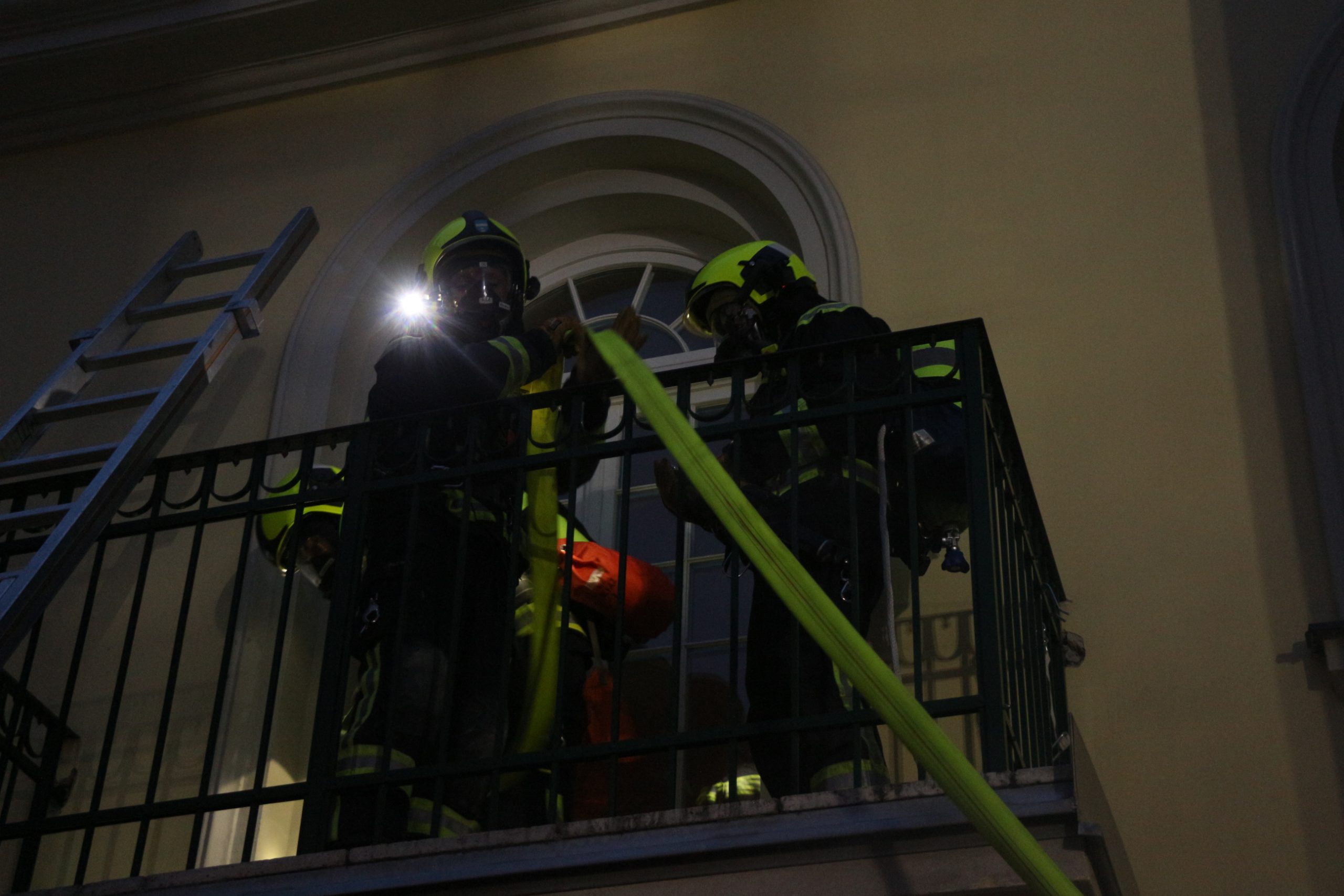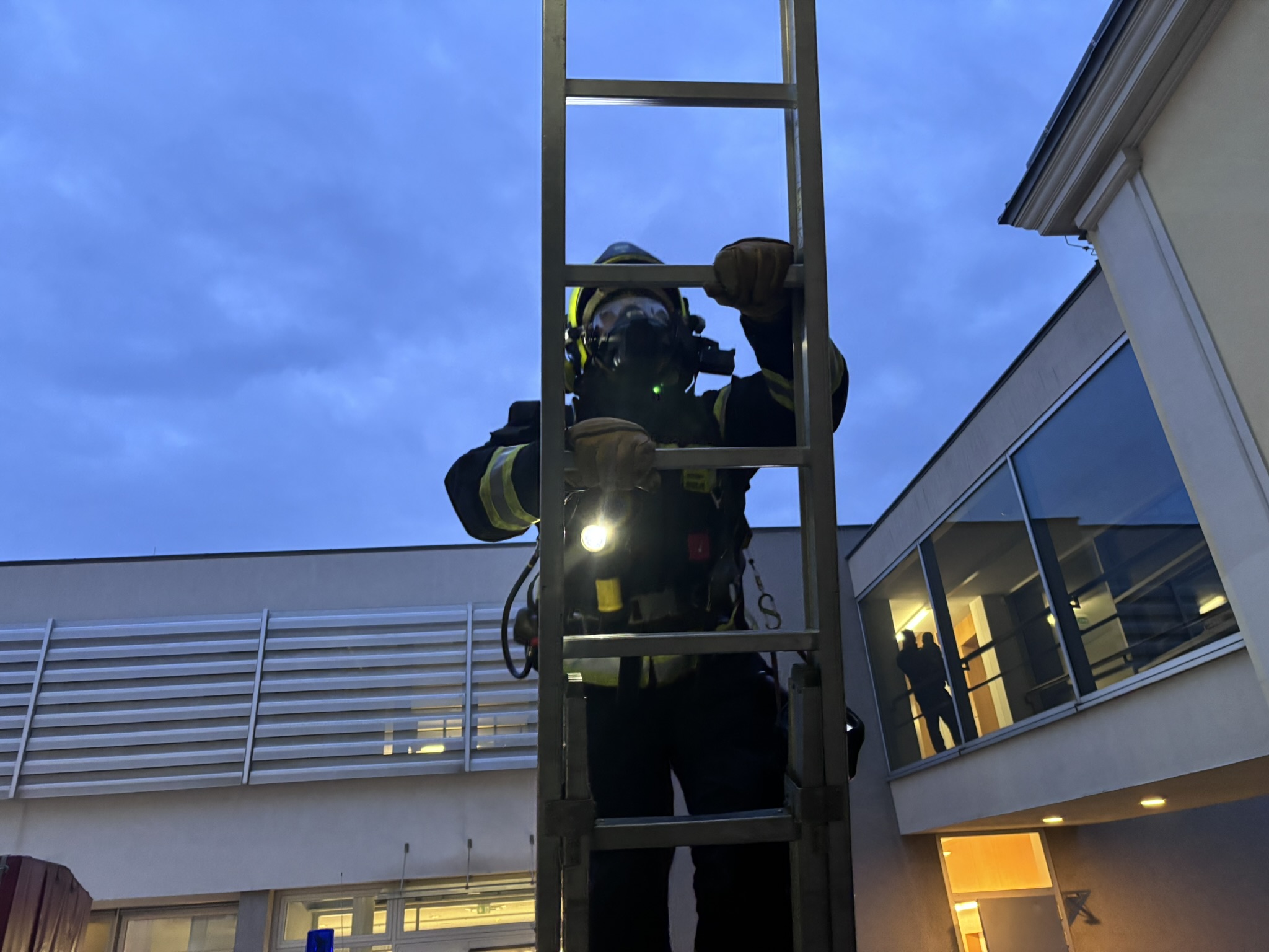 Übungsannahme war ein Brand im Gebäude, bei dem sich mehrere Personen im Inneren sowie auf einem Balkon im ersten Obergeschoss befanden. Zur realitätsnahen Darstellung wurde das Objekt mittels Nebelmaschinen stark verraucht.
