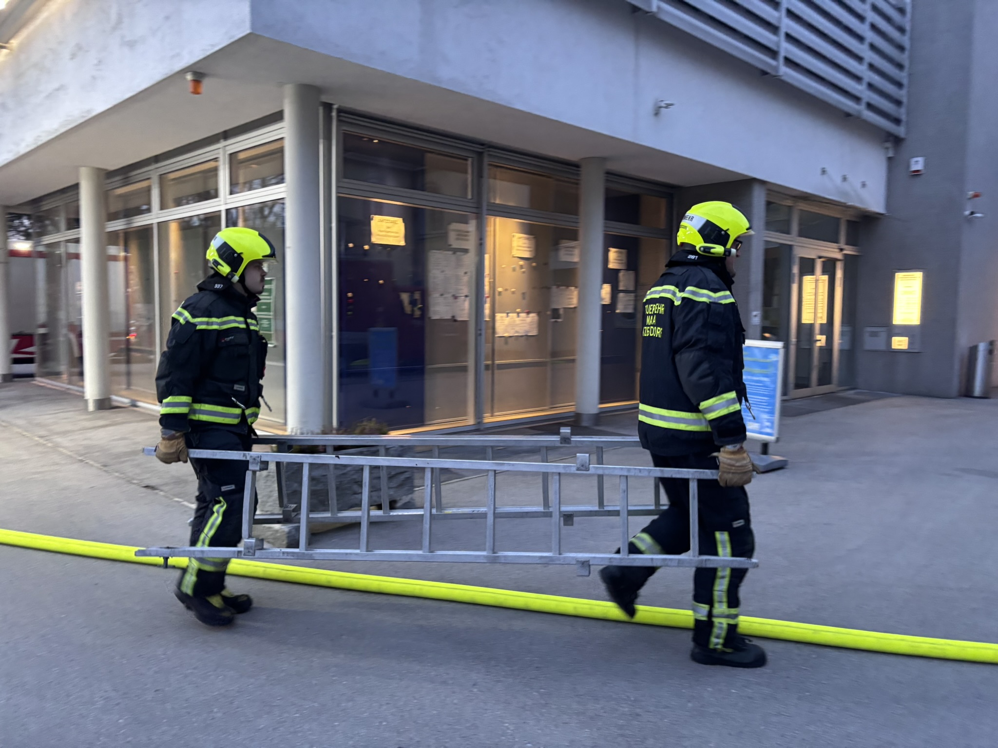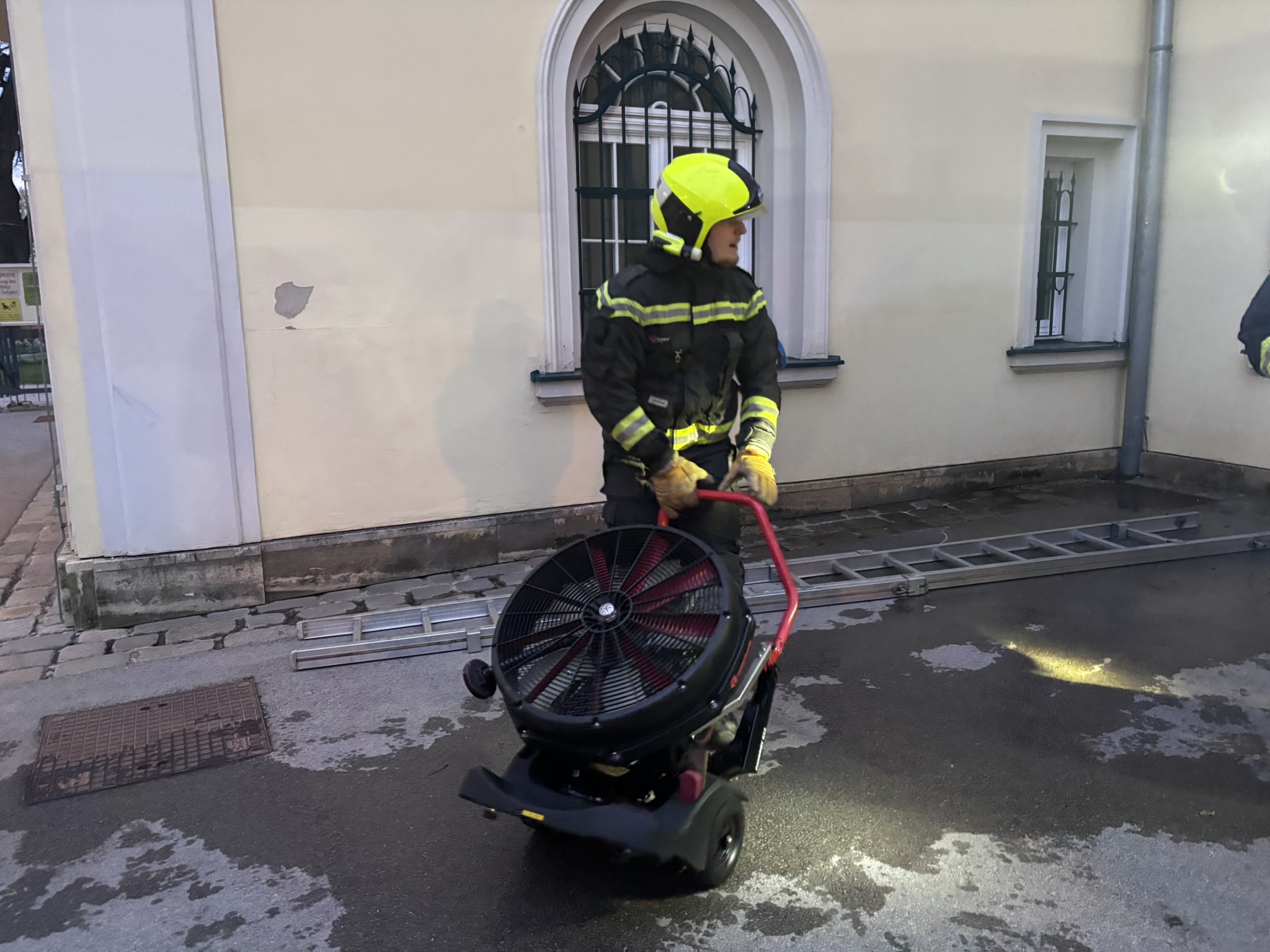 Im Außenbereich wurde anschließend eine Druckbelüftung mittels Drucklüfter über den Eingangsbereich durchgeführt, um das Gebäude rauchfrei zu machen.