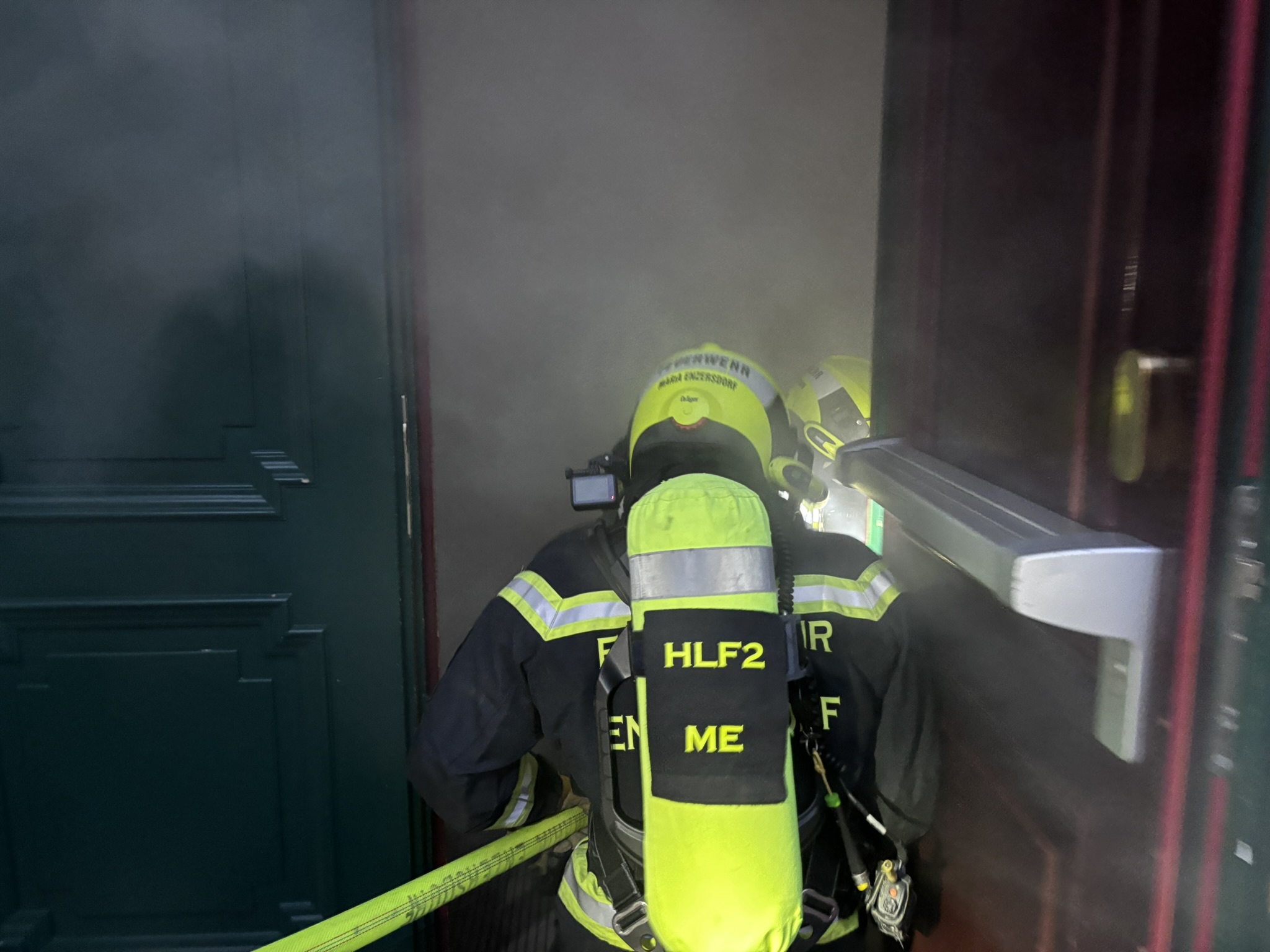 Der erste eintreffende Atemschutztrupp rüstete sich mit einem C-Strahlrohr aus und ging zur Menschenrettung sowie zur Branderkundung ins Erdgeschoss vor. Kurz darauf traf ein weiterer Atemschutztrupp ein, der ebenfalls mit einer C-Leitung zur Personensuche in das Gebäude vorging.